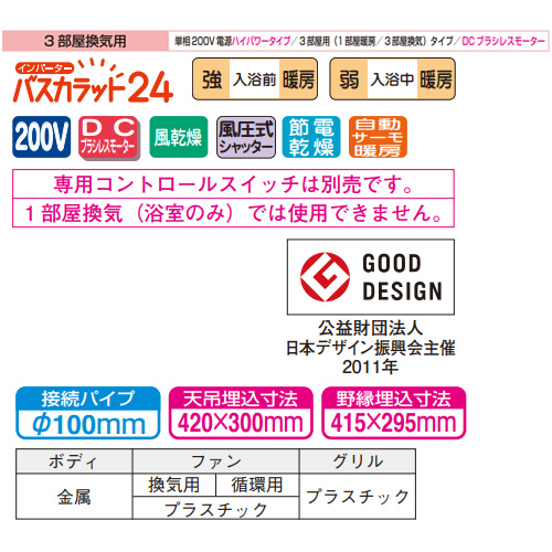 浴室換気暖房乾燥機 バスカラット24[電気式][天井埋込型][200V][24時間換気][3部屋用][ハイパワータイプ][DCブラシレスモーター]