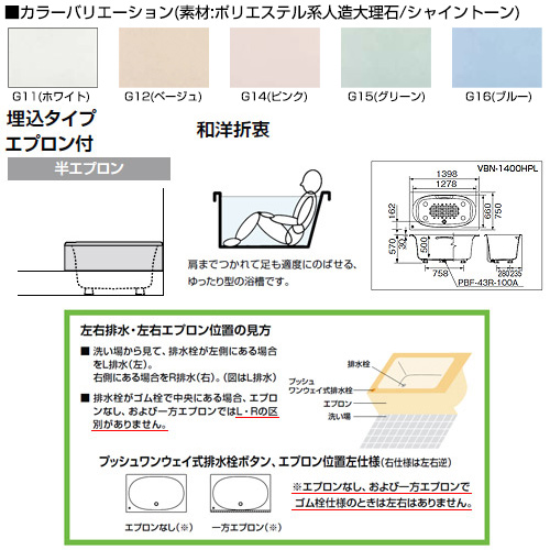●浴槽 シャイントーン[埋込浴槽][和洋折衷タイプ][1400サイズ][1方半エプロン][プッシュワンウェイ][ハンドグリップ]