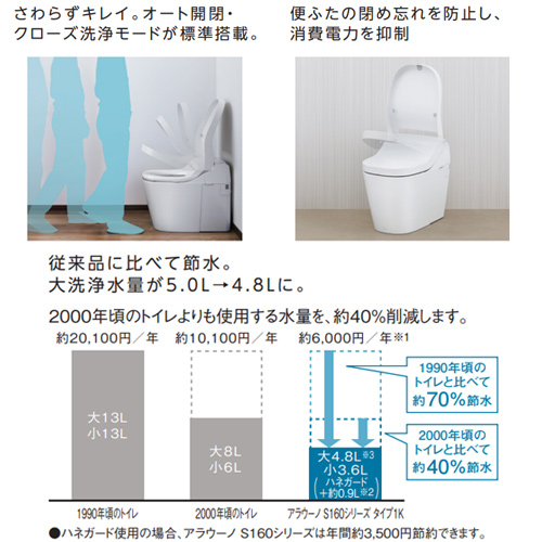 タンクレストイレ アラウーノS160シリーズタイプ1K[床:排水芯305〜470mm][リフォーム][タンクレス便器][泡洗浄][ホワイト][標準リモコン][一般地]