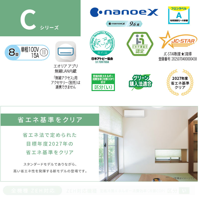 ルームエアコン[Cシリーズ][100V][8畳][2.5kW][エオリア][クリスタルホワイト][2026年モデル]