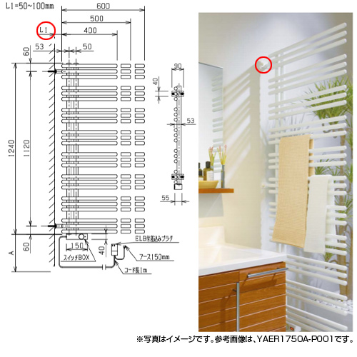 ●タオルウォーマー[リミテッドスペースヒーター][YAE-Rシリーズ][奥行89mm][壁直角取り付け仕様][幅500mm][高さ1240mm]