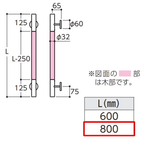 木製手すり インテリアバー[壁固定][I型][多用途用][長さ:800mm][φ32][前出:65mm][天然木タイプ][コンテンポラリタイプ]