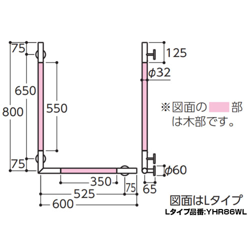 木製手すり インテリアバー[壁固定][L型][多用途用][長さ:600mm][φ32][前出:65mm][天然木タイプ][コンテンポラリタイプ][右仕様]