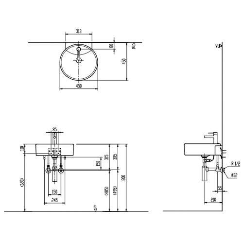 洗面器セット サティス洗面器[壁掛式][丸形][シングルレバー混合水栓][エコハンドル][壁排水][壁給水][ボトルトラップ][一般地]