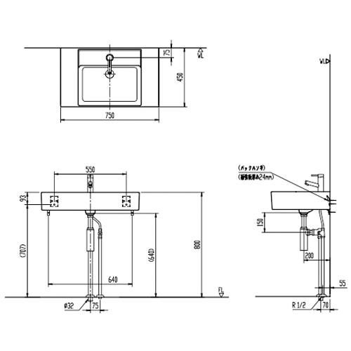 洗面器セット サティス洗面器[壁掛式][角形][単水栓][床排水][床給水][ボトルトラップ][一般地]